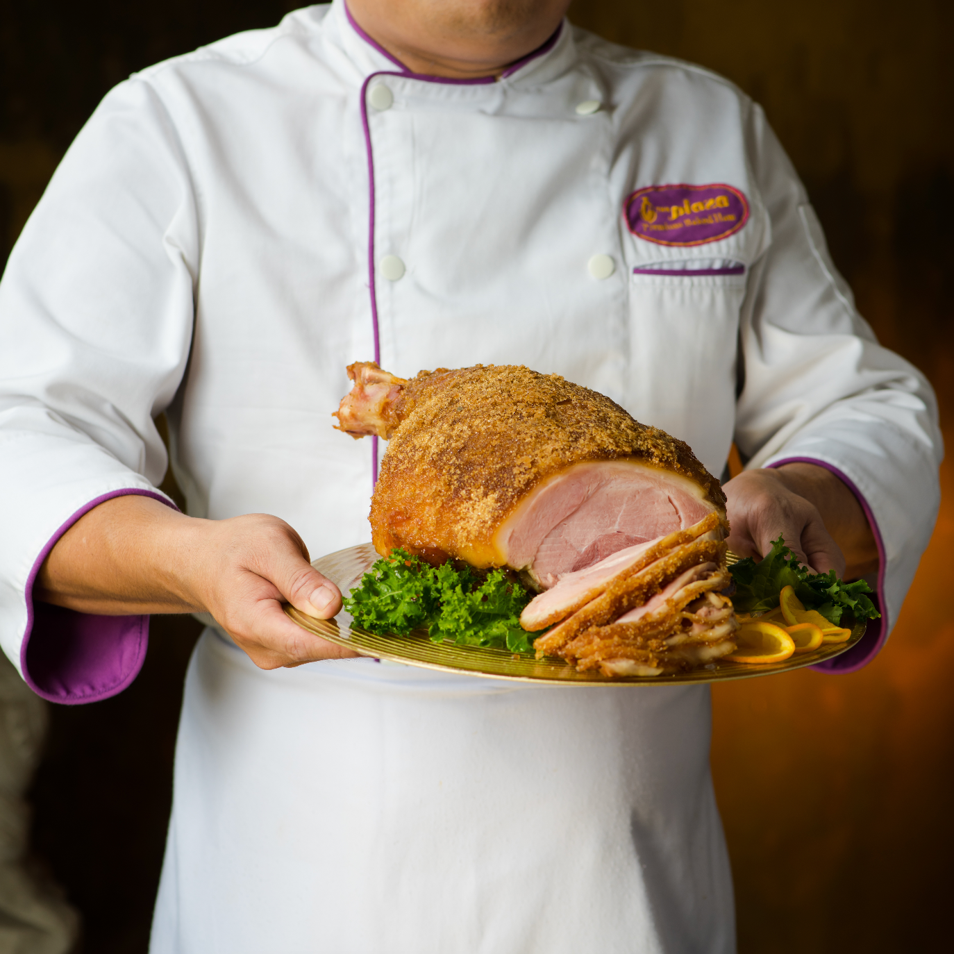 The Plaza Premium Baked Ham was created in the 1960s by Master Chef Gosta Pettersson and co-founder Meldy Reyes. It was inspired by the traditional Swedish Christmas ham but tailored to suit the Filipino palate, striking a perfect balance between sweetness and saltiness. The ham is carefully cured, lightly wood-smoked with a blend of aromatic herbs and spices, then oven-baked to perfection. Finally, it is generously glazed and delicately coated with a sweet, crumbly crust.